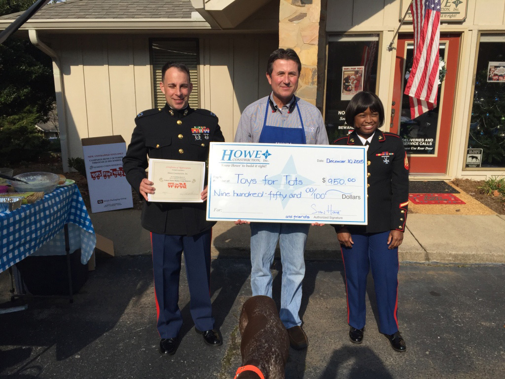 /0 Comments/in News /by Howe ConstructionHowe Construction and Friends donated over $950, 4 boxes of toys and a bike to Toys for Tots. In addition to this incredible donation, HCI also received a special thank you and recognition. A Toys for Tots Marine presented Howe Construction with a Certificate of Appreciation for serving as a 2015 toy collection site.